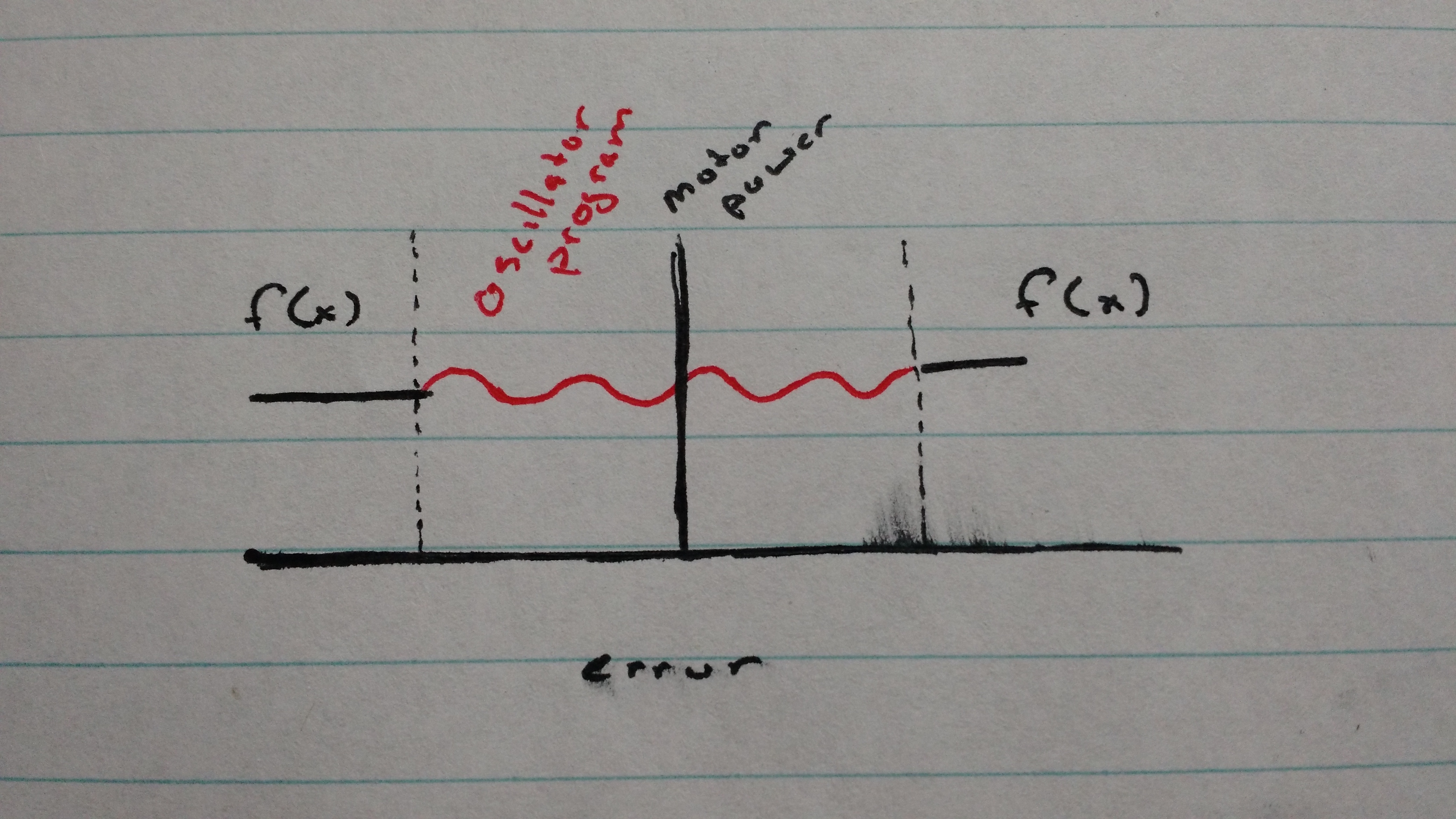 In this case, error = (actual omega – desired omega). Basically when the user changes the desired rpm, the program gets a baseline number (determined by the function above) and uses that until the error gets within a certain threshold (indicated by the dashed lines). Once the error is within that threshold, the oscillation program takes over, and the amount of time that the oscillator takes is reduced because the motor speed is already close enough to the stable value that the oscillator only has to do a minimal amount of work: