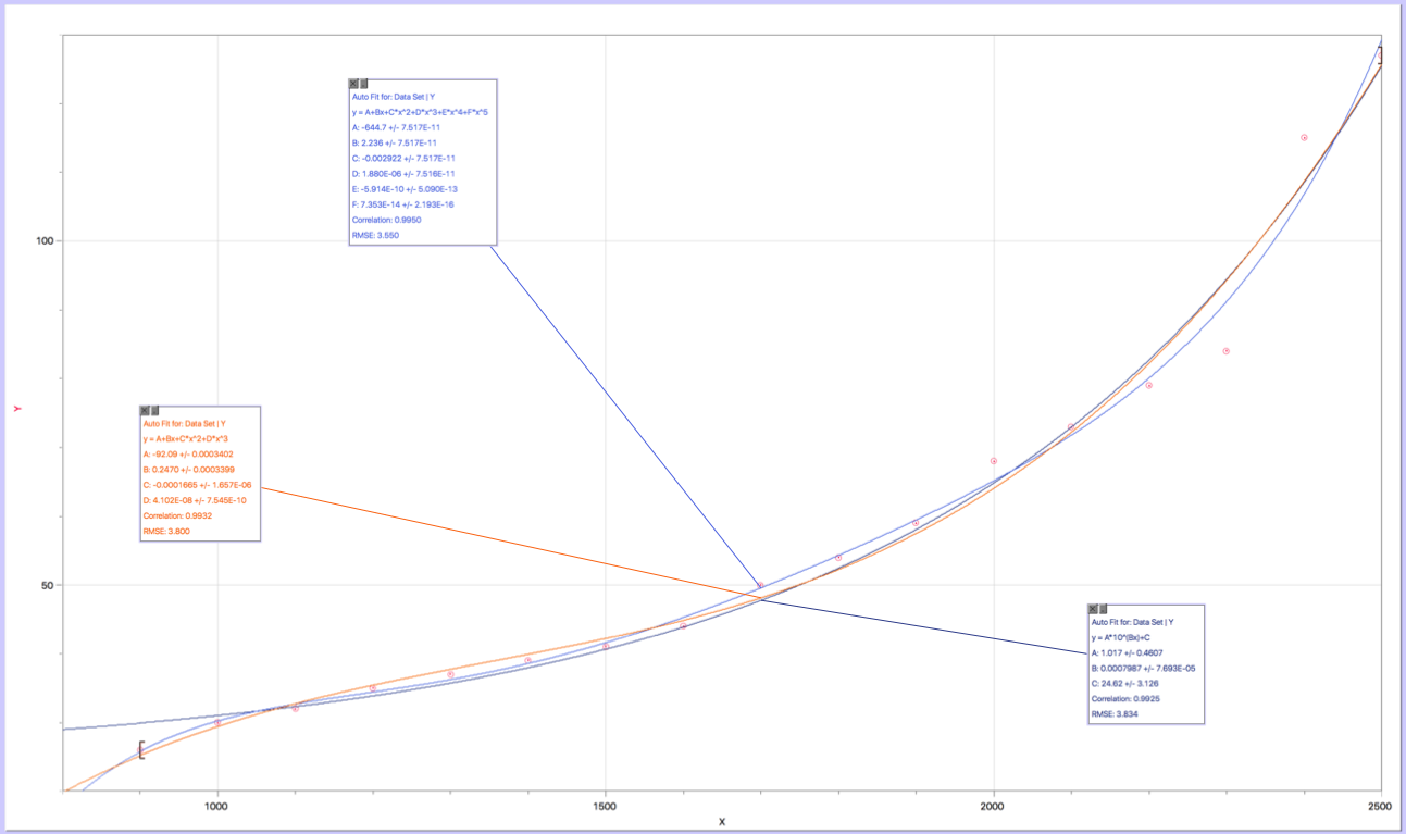 It turns out that the equation for the lines of best fit for the rpms of 1850 and 2155 are nearly the same, and that 2450 starts to plateau off at the end. Instead of making some killer rational function or something like that, I just took the average values from the lines of best fit from the 1850 and the 2155 graphs, and cut it off after the error was over 28 (which was to account for the plateau in the 2450 graph):