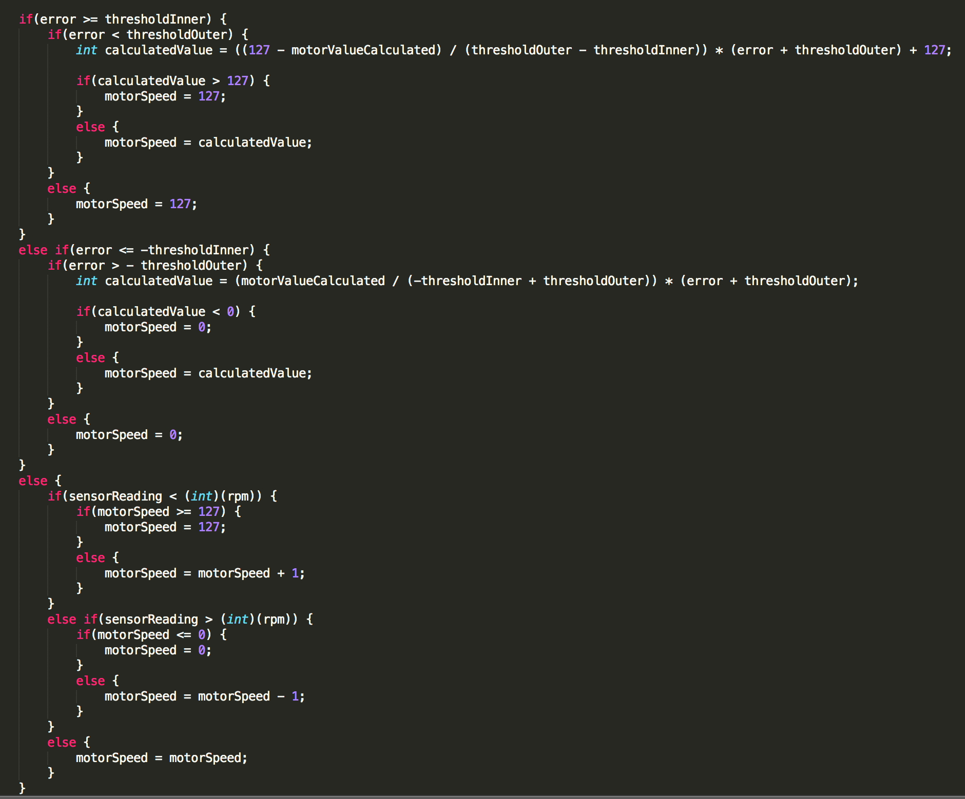 This worked, but it took forever to stabilize. This was due mostly in part to the mass of the flywheel, and the fact that the inertia was messing up the microcontroller. This meant that the motor power would oscillate until it finally got a value that was stable, which is what we wanted, but it did it in 10 seconds, which is something that we did not want (Keep in mind that the whole match is 1.5 minutes long). So we had to work up on another solution.